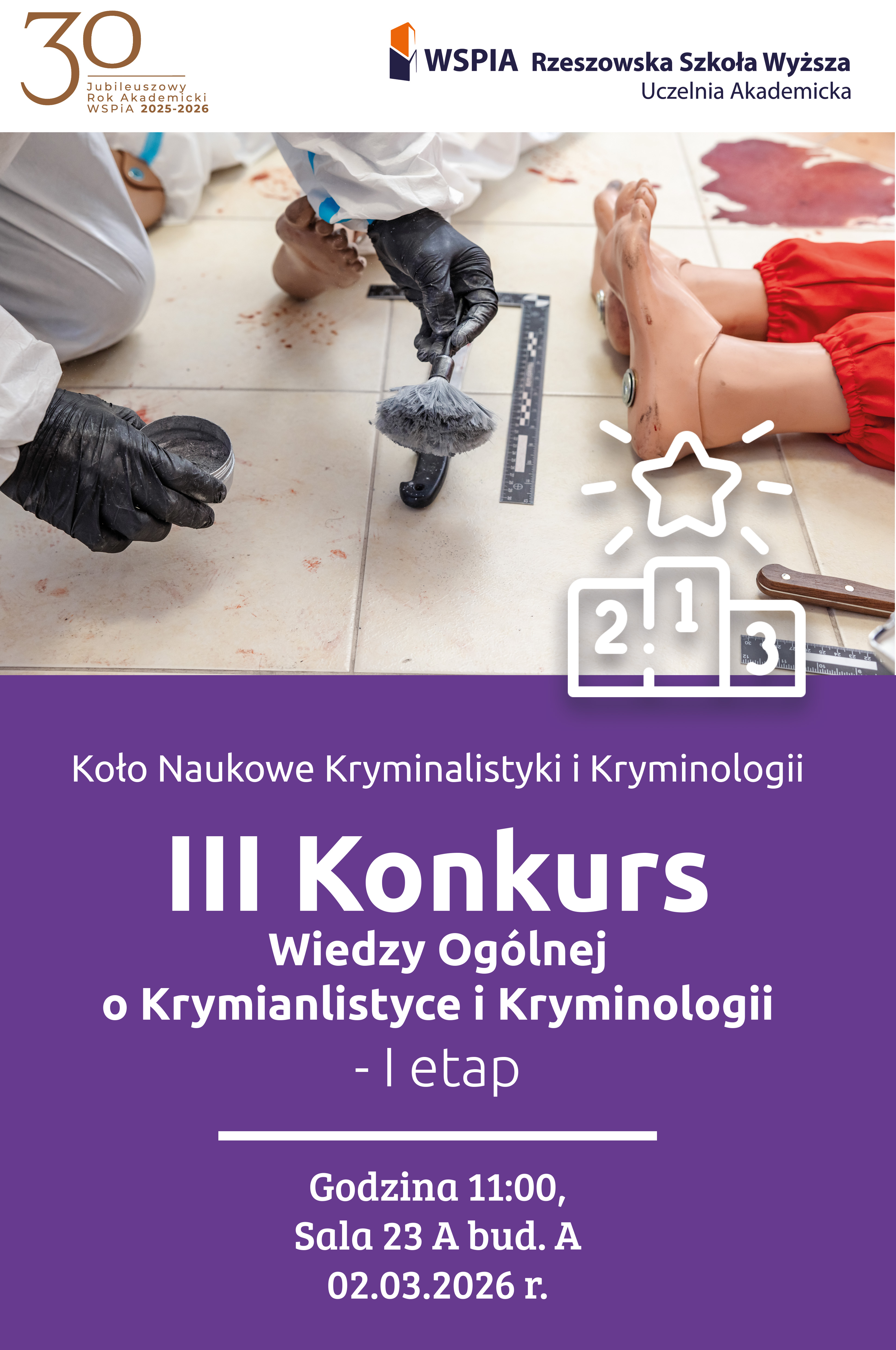 - III Konkurs Wiedzy Ogólnej o Kryminalistyce i Kryminologii - I etap. Godzina 11:00, Sala 23A;
