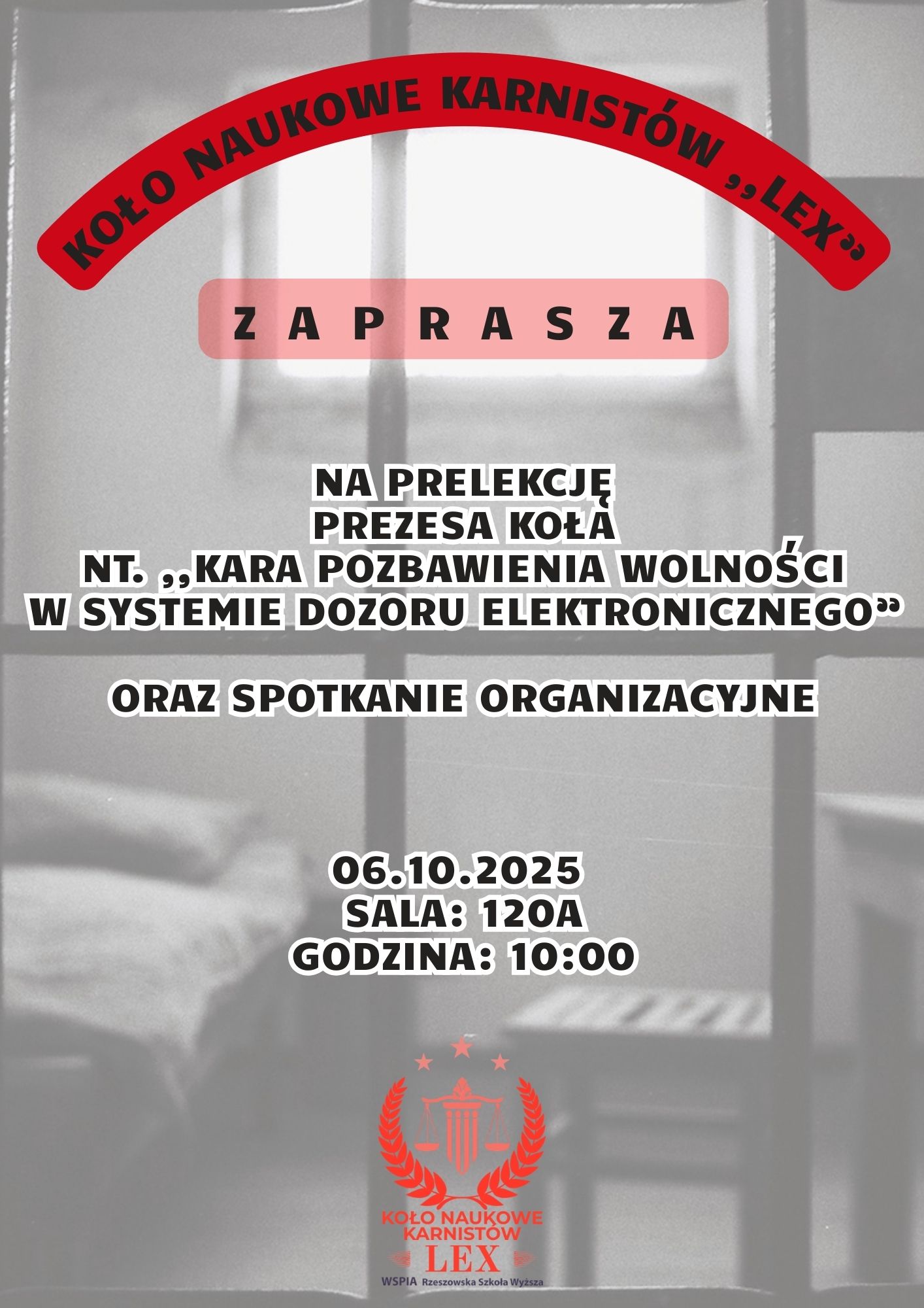 Koło Naukowe Karnistów „LEX” zaprasza wszystkich chętnych na spotkanie organizacyjne oraz prelekcję „Kara pozbawienia wolności w systemie dozoru elektronicznego” – sala 120A, start godzina 10.00