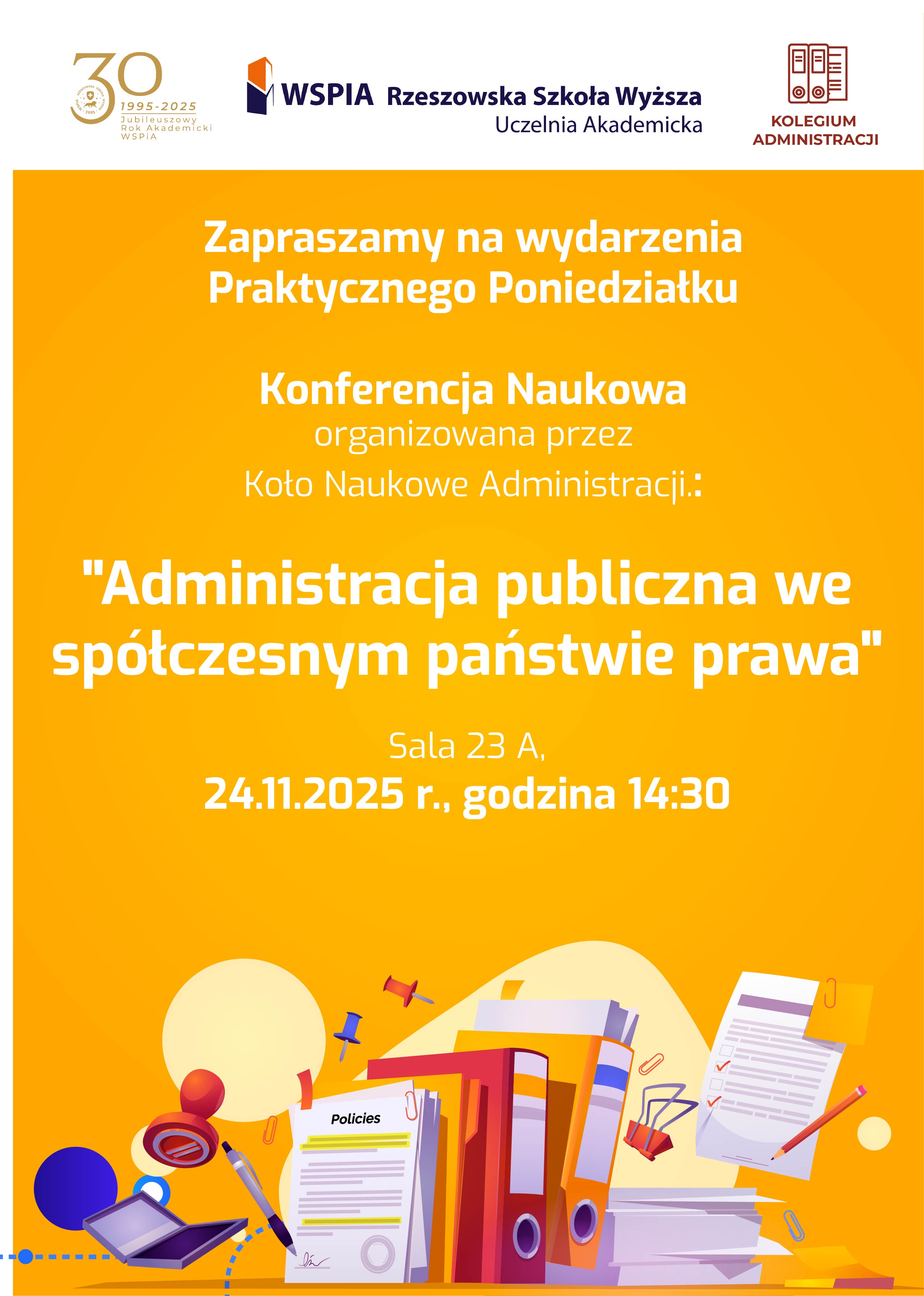 - Konferencja Naukowa pt.: "Administracja publiczna we spółczesnym państwie prawa", organizowana przez Koło Naukowe Administracji. Sala 23 A, godzina 14:30;