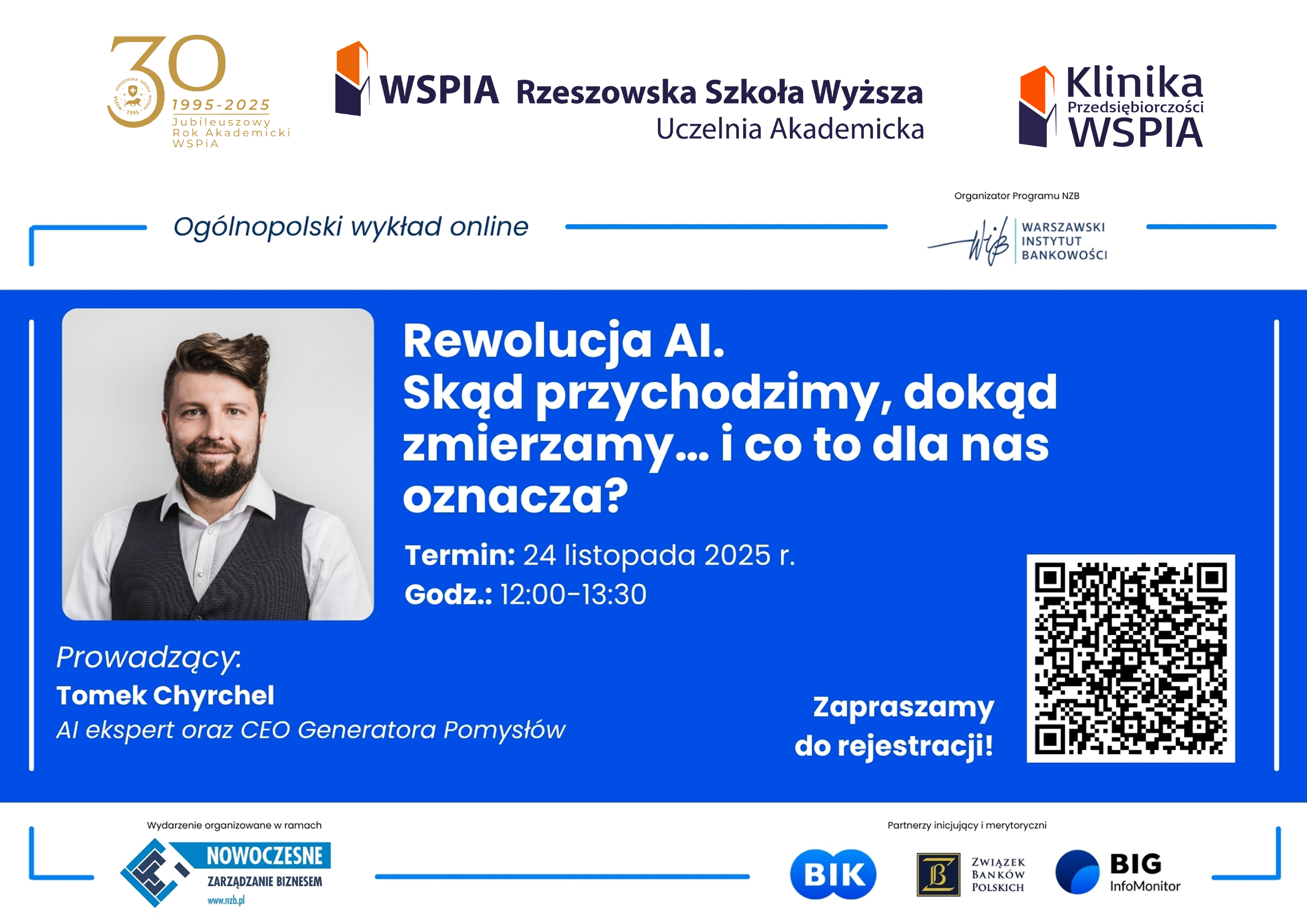 - Klinika Przedsiębiorczości zaprasza na wykład online pt.: „Rewolucja AI. Skąd przychodzimy, dokąd zmierzamy… i co to dla nas oznacza?”, który poprowadzi Tomek Chyrchel, realizowany przez Warszawski Instytut Bankowości o godzinie 12:00.  Każdy z Uczestników otrzyma imienny certyfikat, którego skan należy przesłać na adres praktyki@wspia.eu w celu uzyskania punktów MIX'a. Wymagana wcześniejsza rejestracja. Link: