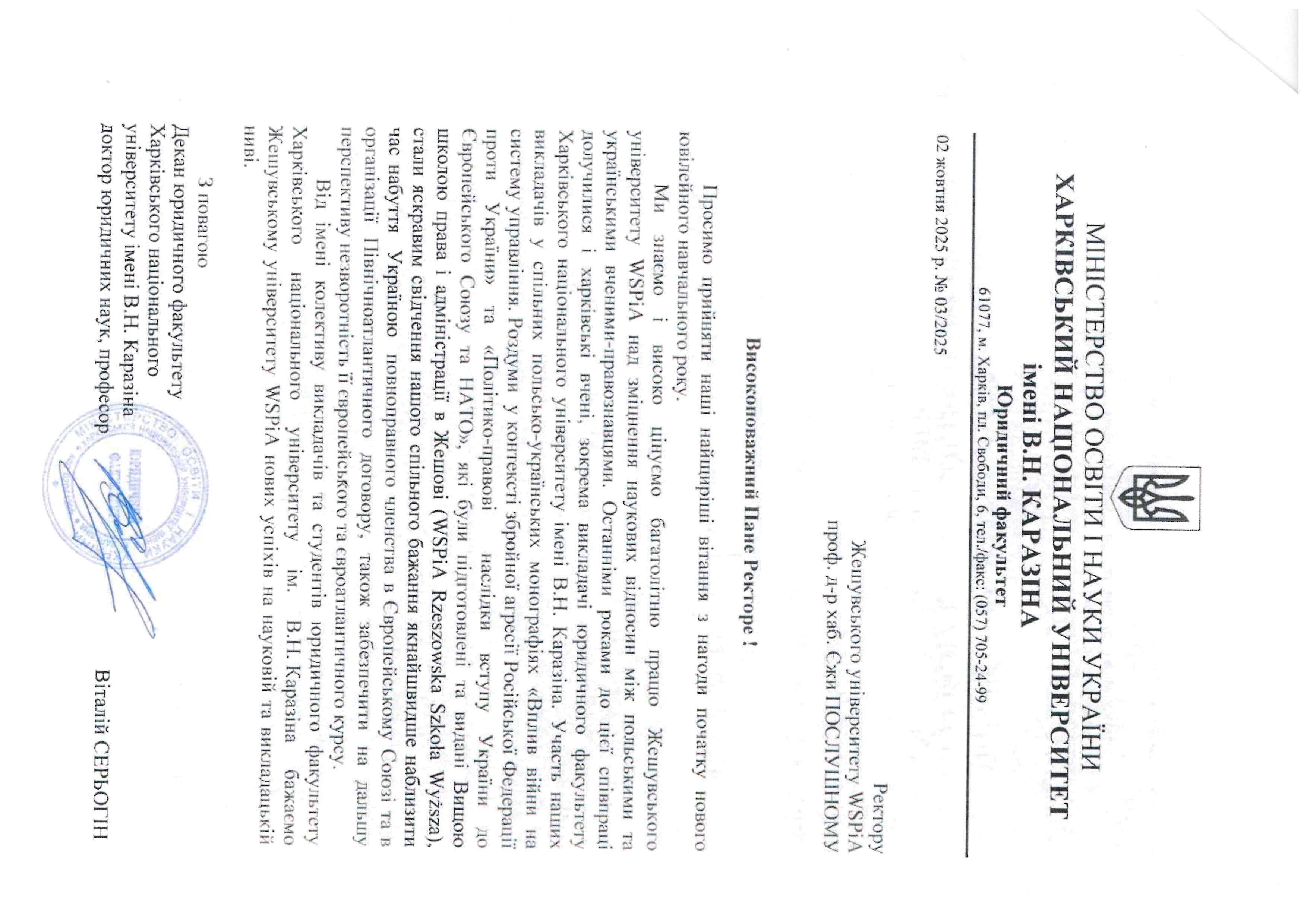 4 października 2025 r. WSPiA Rzeszowska Szkoła Wyższa uroczyście zainaugurowała Jubileuszowy Rok Akademicki 2025/2026. Z tej okazji na ręce Rektora prof. Jerzego Posłusznego wpłynęły liczne listy gratulacyjne oraz życzenia, skierowane przez przedstawicieli parlamentu, administracji państwowej, służb mundurowych oraz środowisk akademickich.