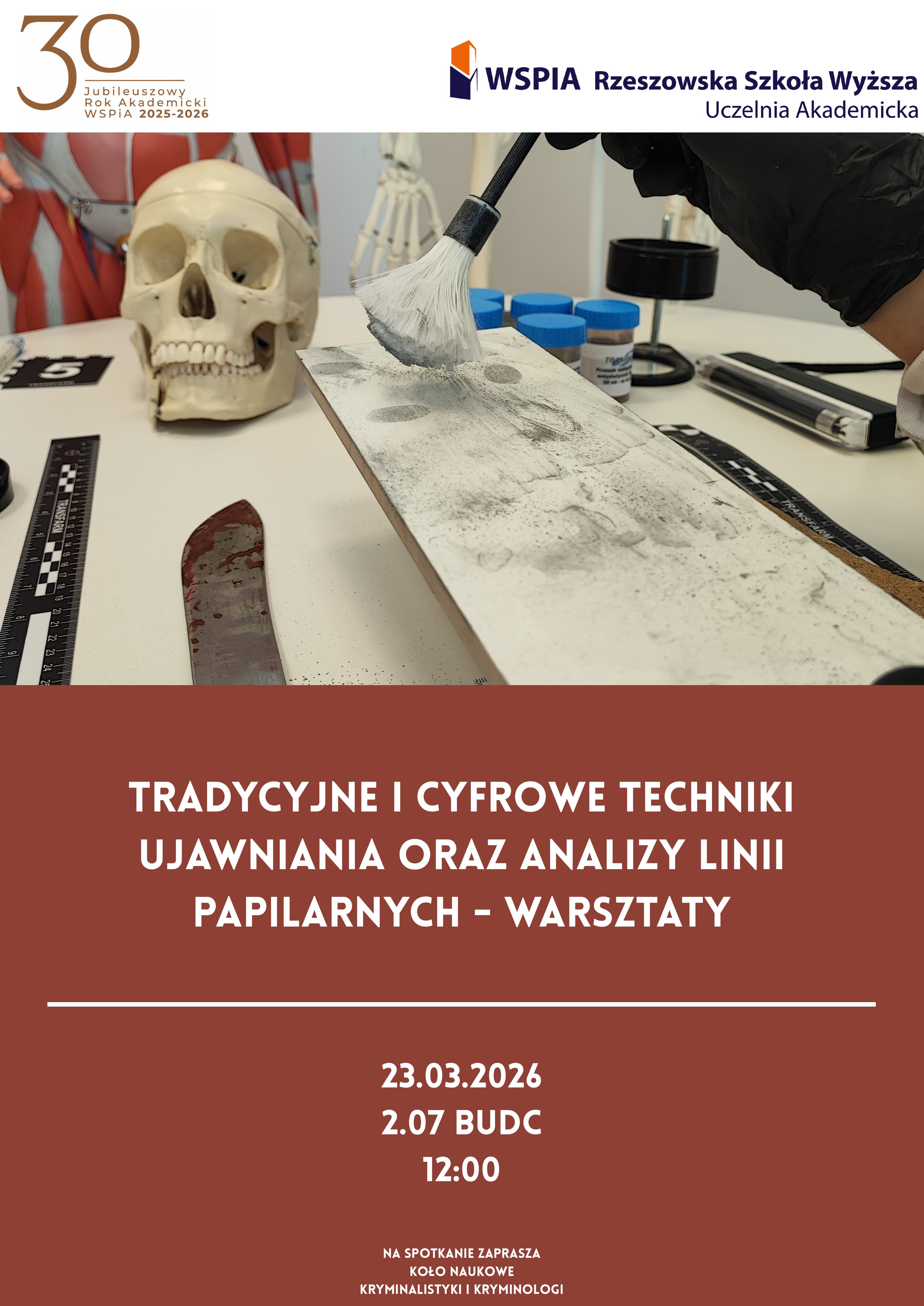 - 12:00 - Tradycyjne i cyfrowe techniki ujawniania oraz analizy linii papilarnych - warsztaty organizowane przez Koło Naukowe Kryminalistyki i Kryminologii. Sala 2.07, bud. B.