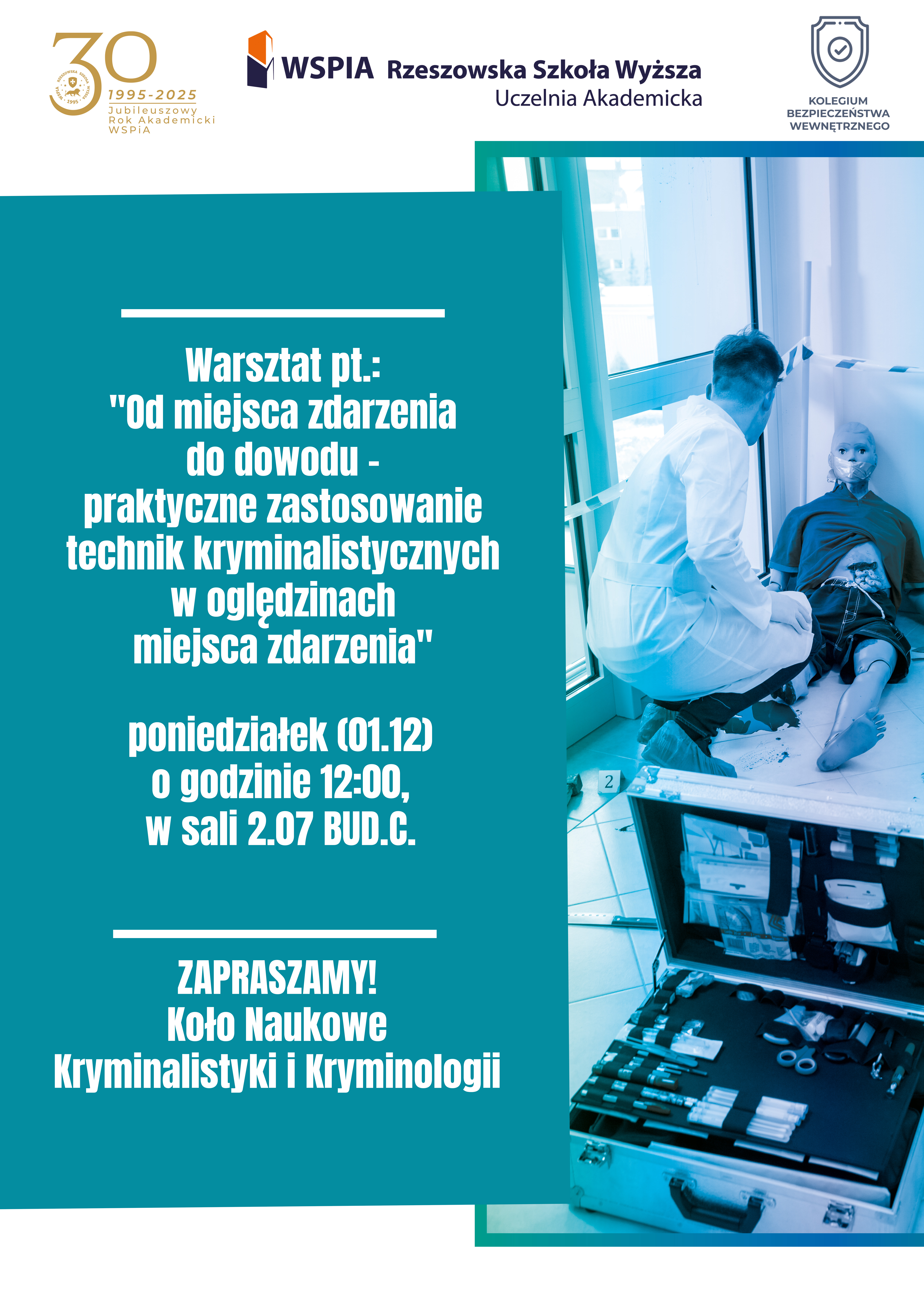 12:00 – Warsztat: „Od miejsca zdarzenia do dowodu – praktyczne zastosowanie technik kryminalistycznych w oględzinach miejsca zdarzenia”, organizowany przez Koło Naukowe Kryminalistyki i Kryminologii – sala 2.07, bud. C.