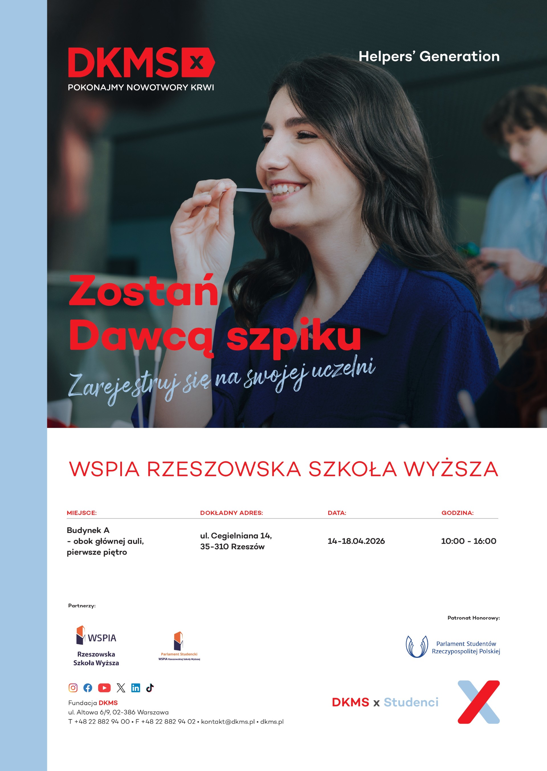 Społeczność akademicka WSPiA Rzeszowskiej Szkoły Wyższej po raz kolejny zaangażuje się w działania o wyjątkowym charakterze. Od 14 do 18 kwietnia 2026 r. w murach Uczelni odbędzie się akcja rejestracji potencjalnych dawców szpiku w ramach studenckiego projektu „HELPERS GENERATION” Fundacji DKMS.