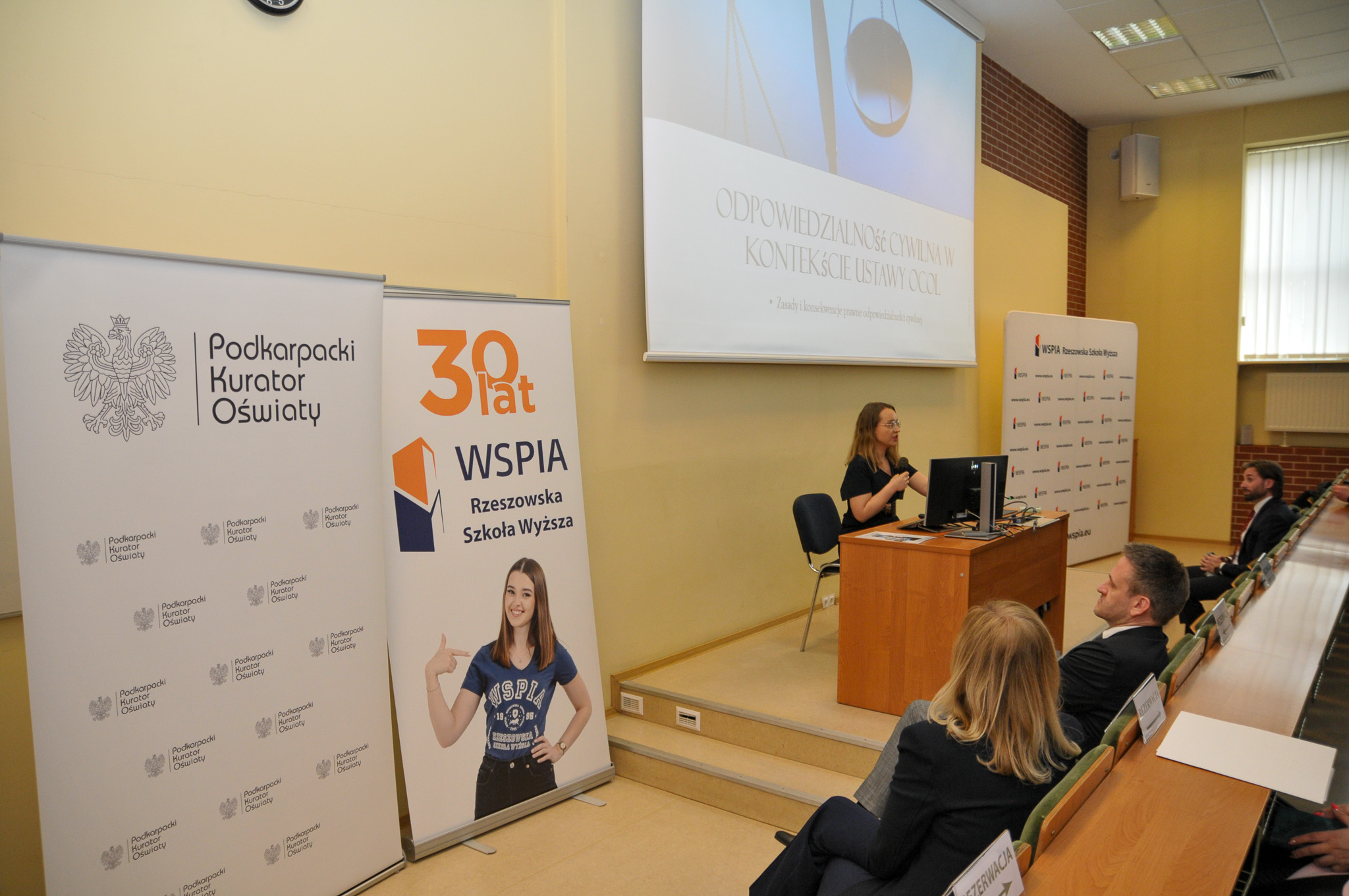 O odpowiedzialności cywilnej dyrektorów szkół i organów prowadzących mówiła dr Natalia Oślizło-Doskocz, wykładowca WSPiA, referendarz w Sądzie Rejonowy w Rzeszowie. Podkreśliła, że w świetle nowych przepisów szkoła staje się elementem lokalnego systemu bezpieczeństwa, co oznacza również nowe obowiązki dla osób zarządzających placówkami.